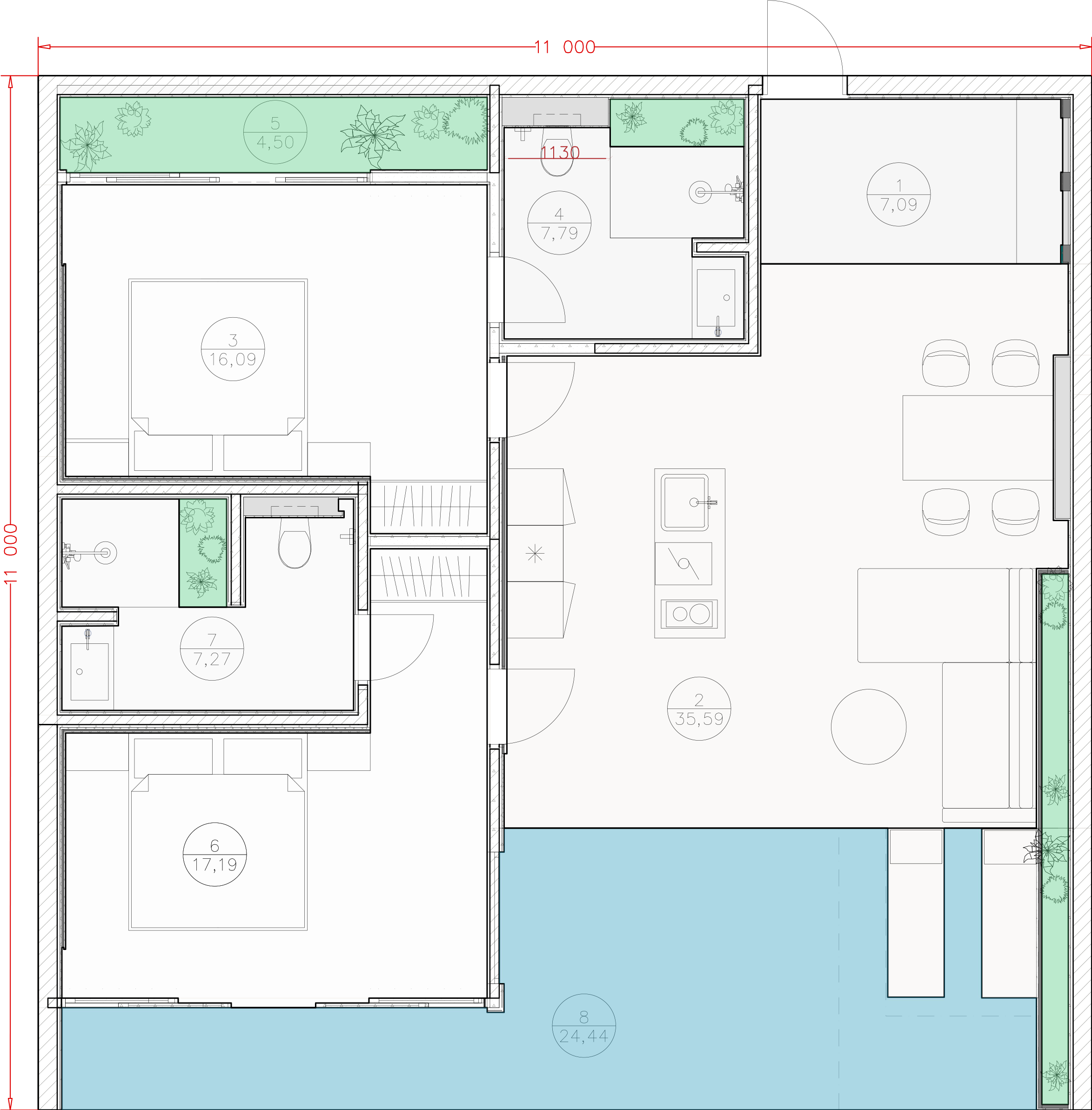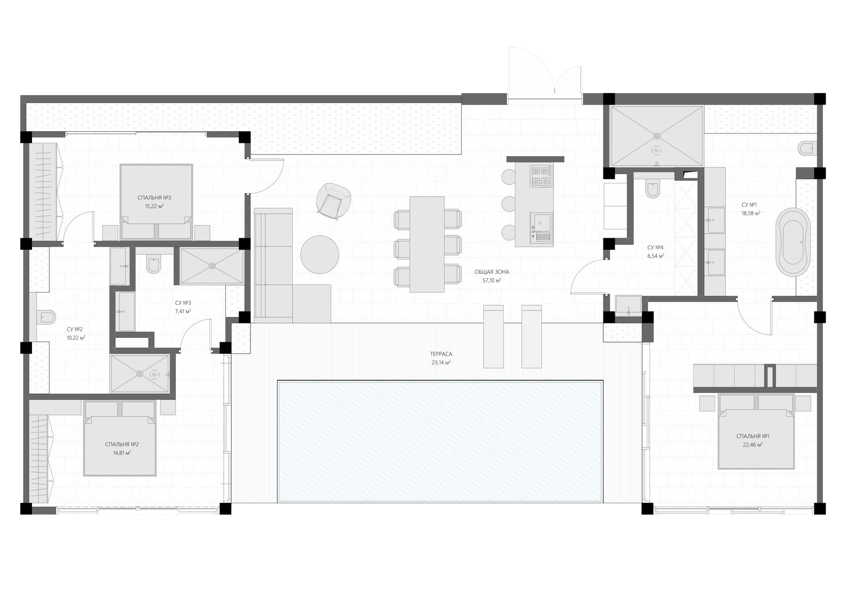 3 спальни, 4 санузла, общая зона с кухней