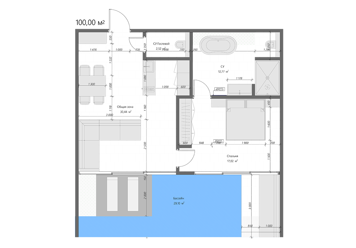 1 спальня, 2 санузла, общая зона с кухней