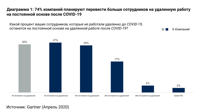 Согласно исследованию Gartner, почти три четверти (74%) финансовых директоров ожидают, что после коронавируса Covid-19 значительное количество сотрудников, которые ранее находились в офисе, перейдут на постоянную удаленную работу. Этот переход в первую очередь вызван желанием сократить расходы на коммерческую недвижимость.